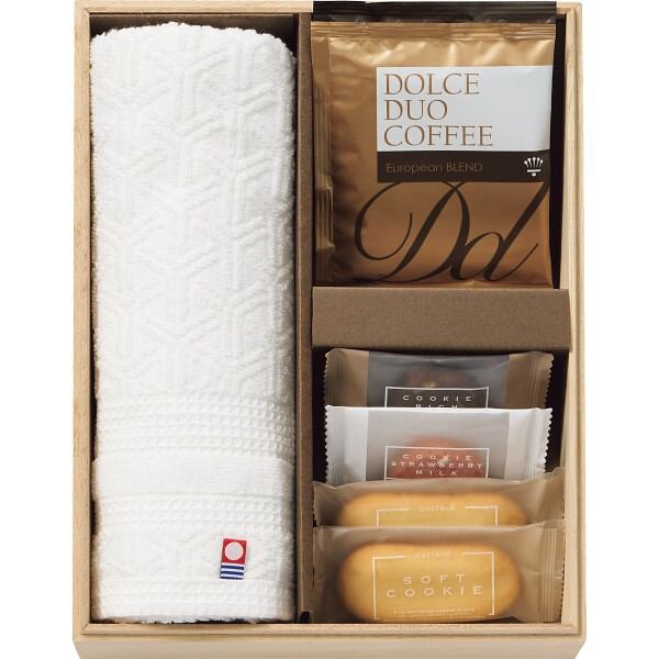 商品内容:●今治産フェイスタオル(約34×75cm・綿100%・日本製)1枚・ソフトクッキー×2・クッキー(いちごミルク×1・ココア×1)・ドリップコーヒー×2