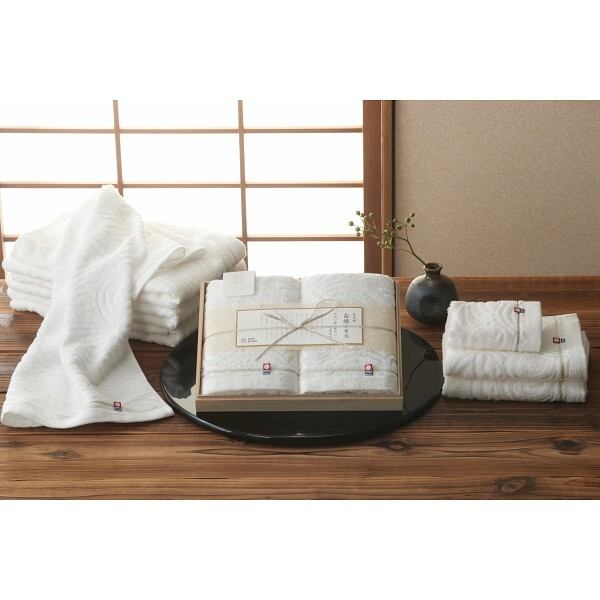 料理に使用する程度の酸と天然の酵素で綿の精練・漂白を行い、不純物を取り除くことで、綿本来の吸水性を引き出しました。上質感のある木箱に納めた純白のタオルはどのようなシーンでも喜ばれる一品です。