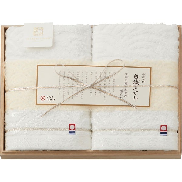 ■料理に使用する程度の酸と天然の酵素で綿の精練・漂白を行い、不純物を取り除くことで、綿本来の吸水性を引き出しました。上質感のある木箱に納めた純白のタオルはどのようなシーンでも喜ばれる一品です。