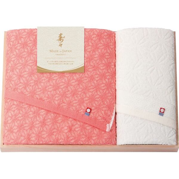 晴れの日を彩る紅白の色彩に成長を願う麻の葉模様を織り上げた、格調高い木箱入りの今治タオル。