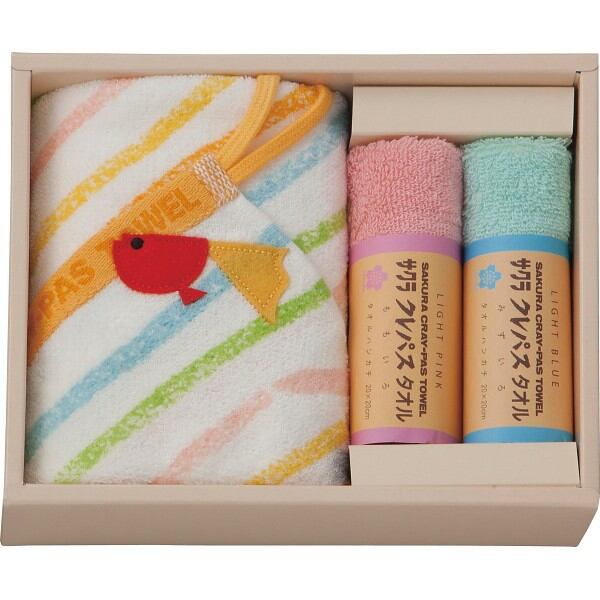 ■誰もが知っているおなじみのクレパスがタオルギフトになりました。クレパスと同じデザインの箱の可愛さもポイントです。大人にとってはどこか懐かしい‥出産内祝いの贈りものにおすすめです。