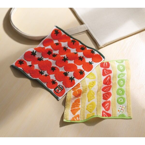 食べること、料理が大好きな人へ どんな嫌なことがあっても、食べ物は心を温かく、幸せにしてくれる。そんな食べ物の不思議な魅力をハンカチに込めました。普通糸と無撚糸を組み合わせることでふんわりと優しい触り心地。