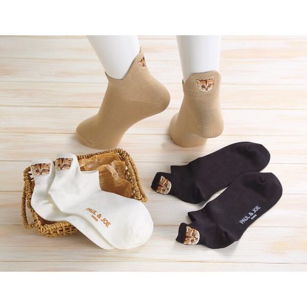 かかとのベロ部分にヌネットフェイス刺繍が入ったアンクルソックス。ポール&ジョーのアイコンねこのヌネットがスニーカーのかかとからちらっと見えるキュートなデザインです。
