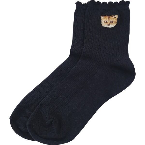 ベーシックなリブ編みにかわいいヌネットの刺繍がポイントのロークルー丈のソックス
