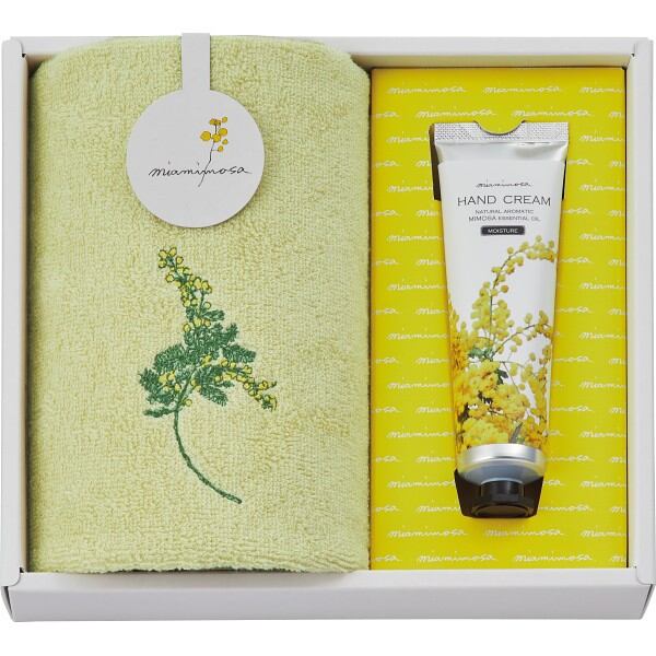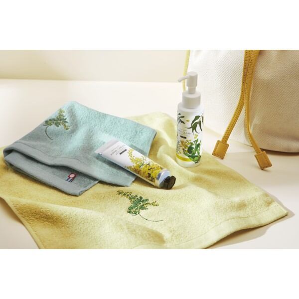 春を告げる花ミモザをモチーフとした今治タオルと、天然香料ミモザ精油がふんわりと柔らかく香る、するすると伸びる滑らかな使い心地のハンドクリームのセット。ハンドクリームはヘーゼルナッツオイルとアロエベラエキス配合でしっかり潤うのにべたつかず、やわらかな手肌へ導きます。