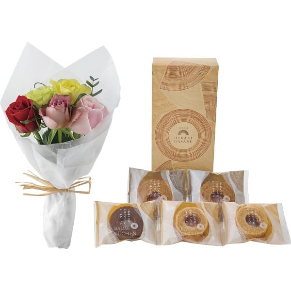 新鮮なバラのブーケと、ふんわりとした食感にしっとり優しい甘さのバームクーヘンのギフトセットです。お部屋を華やかに彩るバラとスイーツのセットは、誕生日、御祝、御礼などにぴったりです。幅広い年齢層に喜んでいただけます。