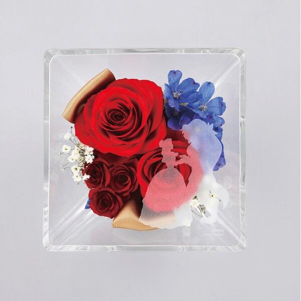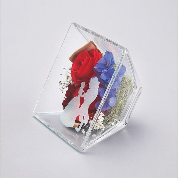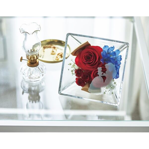 独自の乾燥方法で生花を美しくドライ加工。着色は一切していない、特殊加工のフレッシュドライフラワー。フレッシュさと鮮やかな色が残るドライフラワーは、生花に近い質感で長期間きれいなままでお楽しみいただけます。ガラス面にキャラクターのシルエットをガラスカッティングで表現しています。美しい『美女と野獣』の世界観ををお楽しみください。