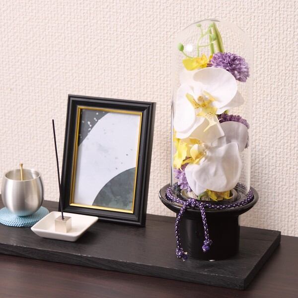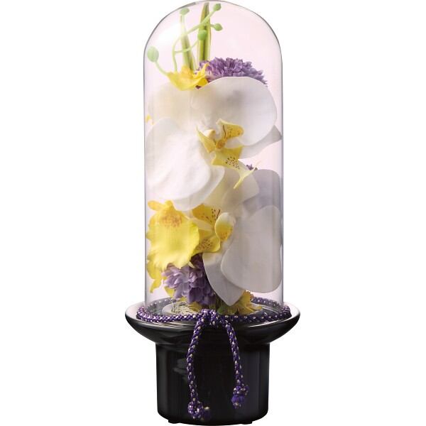 お手入れはガラスドームを拭くだけ。花にホコリが付くことがないのでいつまでも美しい状態で飾れます。高品質な胡蝶蘭が主役の高貴で華やかな供花です。
