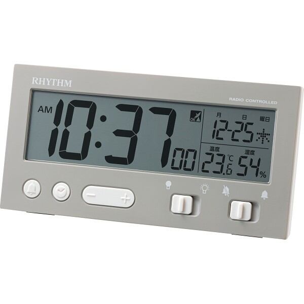 癖のないシックなグレイッシュカラーが特徴の、夜間自動点灯つき電波デジタルめざまし時計です。