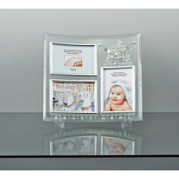 ■透明のガラスにベビーモチーフをプリントし、可愛いメリーチャームを付けました。ベビーギフトにお使い頂けるフォトフレームです。