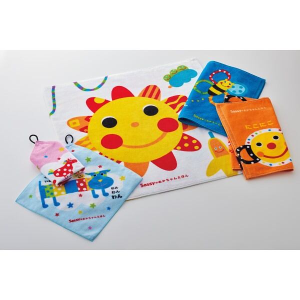 創業以来、40年以上にわたって世界のママ&ベビーに愛されるサッシー。その絵本シリーズの中でも人気を集める『にこにこ』『がおー』をモチーフに、見て触れて使って楽しいタオルシリーズを作りました。
