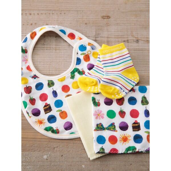 人気絵本のはらぺこあおむしとのコラボシリーズ。星柄の滑り止めのついたソックス入りのギフトボックス。安心安全の日本製になります。