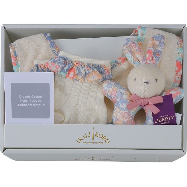 人気のリバティプリントを使用したスタイとラトルのギフトセットです。専用ボックスに入った人気のモデルです。