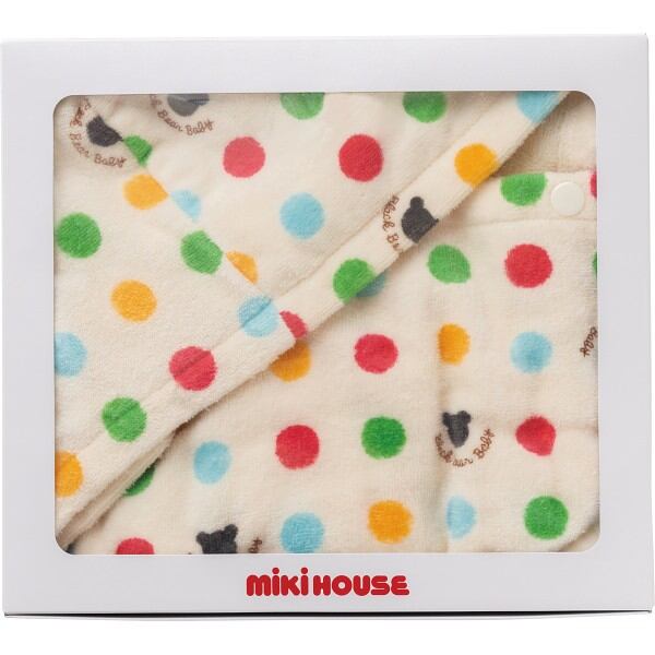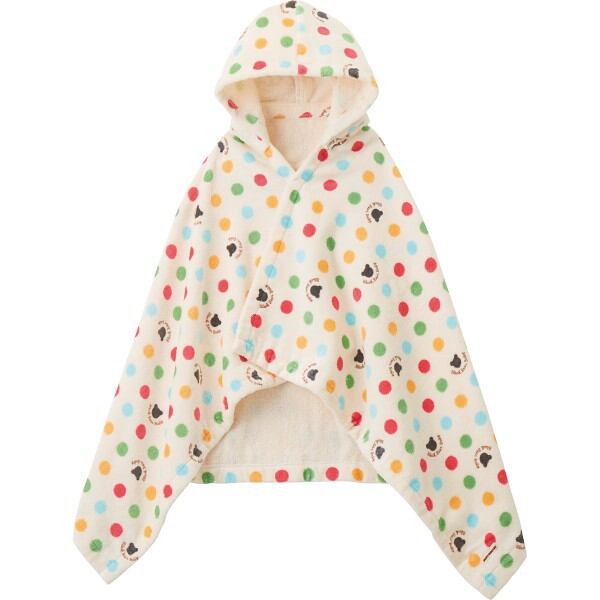ドットと黒クマ柄のフード付きバスポンチョです。広げればバスタオル、ホックをとめればポンチョとして使用可能。お風呂あがりや、プールの後にも便利です。新生児から2歳ごろまで使え、出産祝い、プレゼントにおすすめです。
