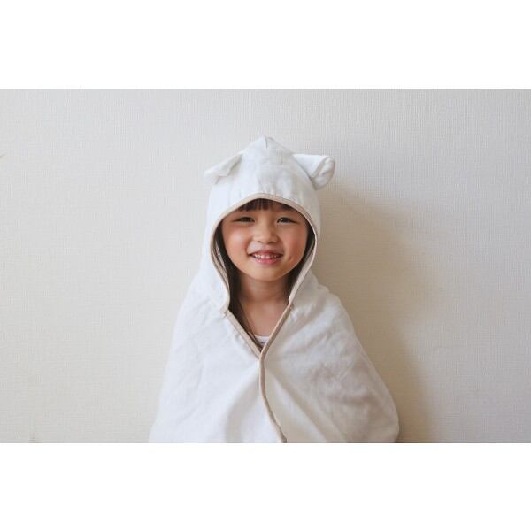 オーガニックコットン100%のキュートなねこの耳付きバスポンチョ。ちいさなお子様でも使いやすい短めサイズです。ねこのポンチョは表は通気性が良く肌触りのやさしい二重ガーゼ、裏は吸水性の良いパイルのふたつの良さを兼ね備えました。