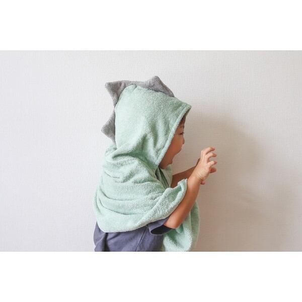 オーガニックコットン100%のかいじゅうのトサカ付きバスポンチョ。ちいさなお子様でも使いやすい短めサイズです。