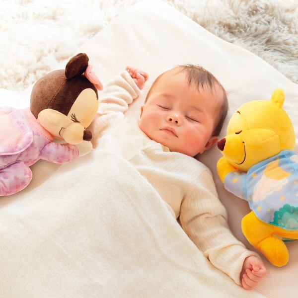 赤ちゃんの心拍数に合わせた曲で心地よい眠りに誘う「ぐっすりメロディ」と、ぐずり泣きに効果があると言われる「胎内音」が入った、ベビーミニーのぬいぐるみ。(※ぐっすりメロディとは、日本音響研究所と共同開発の寝かしつけのために開発されたオリジナル音楽。)胎内音などのやすらぐ環境音が2種類・ぐっすりメロディや子守歌、童謡など6曲収録。ぬいぐるみは手洗い可能。