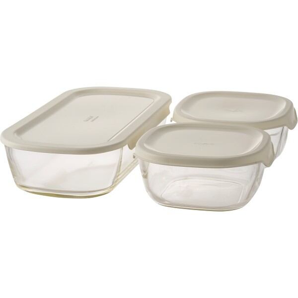商品内容:●正方形M(約14.3×13.9×6.2cm・600ml)×2、長方形M(約27×14.5×6.2cm・1.4l)×1●電子レンジ可●オーブンレンジ可(ガラス本体のみ)