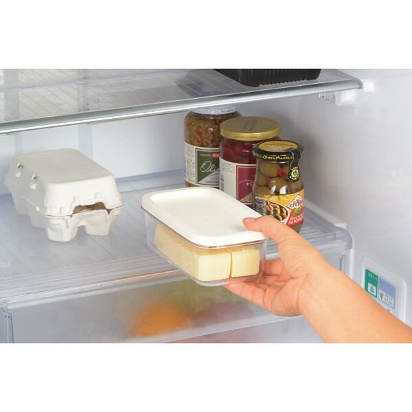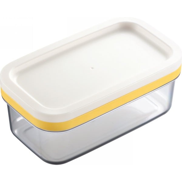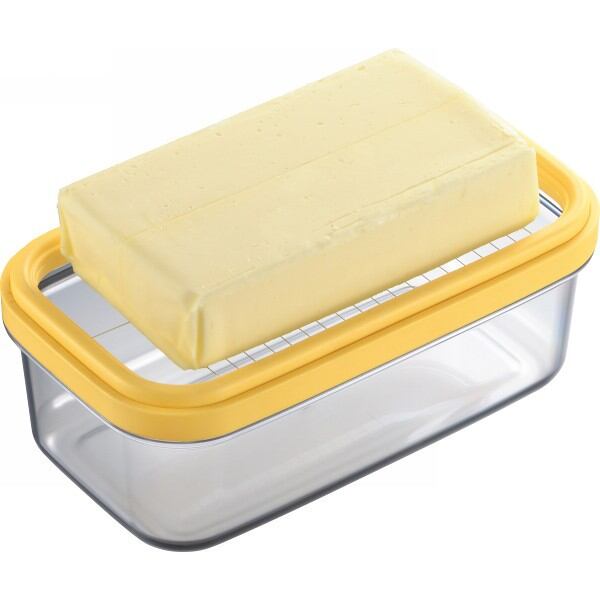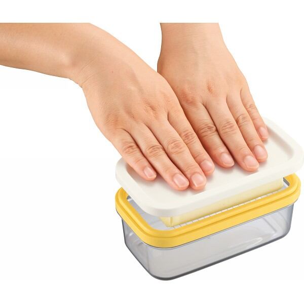 ギュッとひと押しで、市販のバターを約5グラムのうす切りにカットできる。バターに触れずにカットしてそのままストック。