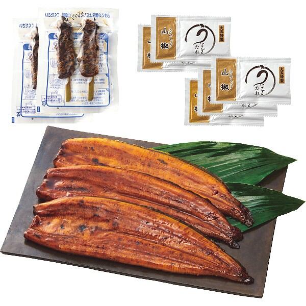 商品内容:●長蒲焼×3(計360g・真空個包装・うなぎ:宮崎県または静岡県産)、山椒付きタレ15ml×5、焼肝串30g×4※山椒付きタレ、焼肝串のパッケージデザインは変更になる場合がございます。