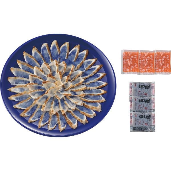 商品内容:●とらふぐたたき刺身(27cm皿)100g、ふくポン酢10g×3、もみじおろし10g×3 トラフグ(長崎県産、熊本県産:養殖)