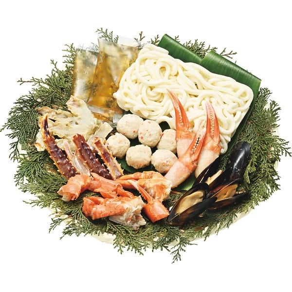 商品内容:●うどん250g(国内製造)、紅ずわいがにカット100g、たらばがにカット100g、ムール貝4枚、紅ずわいがに爪3個、かに入つみれ3個、えび入つみれ3個、鍋たれ50ml×2個