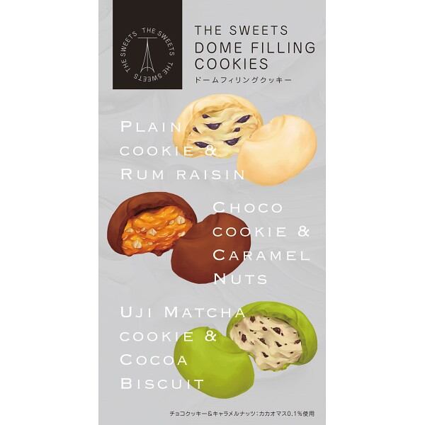 食感が楽しい素材がたっぷりつまった、包あん型のクッキー。【チョコクッキー&キャラメルナッツ】チョコ生地になめらかなキャラメルとサクサクナッツが入ったクッキー。【プレーンクッキー&ラムレーズン】プレーン生地にラムレーズンが入ったクッキー。【宇治抹茶クッキー&ココアビスケット】宇治抹茶の生地にザクザク感が楽しいココアビスケットが入ったクッキー。