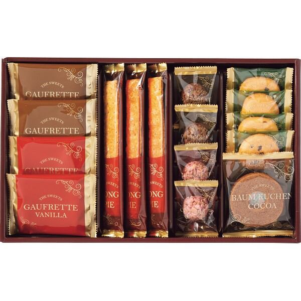 商品内容:●チョコチップクッキー×4、ロングスティックパイ×3、バウムクーヘン(ココア)×1、ゴーフレット×4(チョコ・バニラ×各2)、チョコレートクランチ×4(ミルク・ストロベリー×各2)