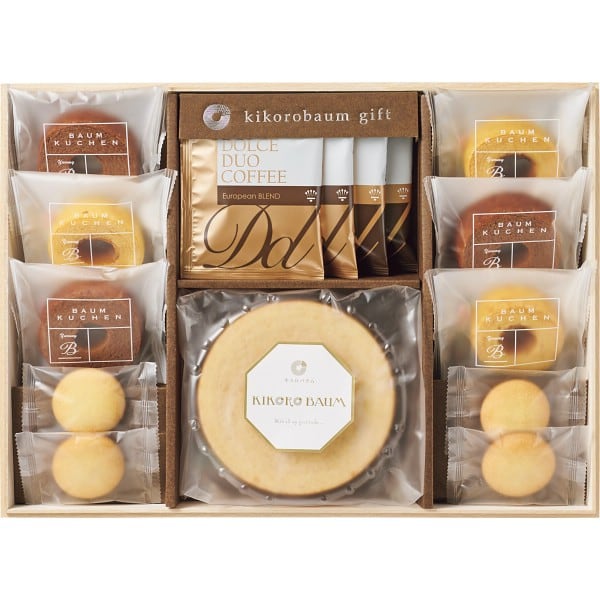 商品内容:●バウムクーヘン(北海道産生乳100%の生クリーム使用)(約13φcm)×1、ミニバウム(チョコ・バニラ)×各3、チョコインクッキー×4、ドリップコーヒー×4