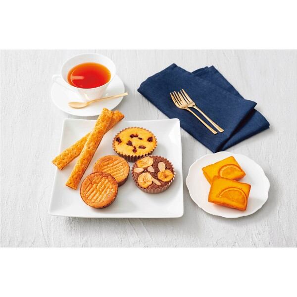 しっとり生地にフルーツやナッツを飾ったプチケーキやオレンジケーキ、さくっとした食感の中にキャラメルの風味が香る少し長いサイズのロングパイ、アーモンドが香ばしく香るフランス伝統の厚焼きクッキーと、ホテルの豊かなティータイムを演出するスイーツを詰め合わせました。