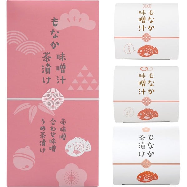 商品内容:●もなか味噌汁(赤味噌・合わせ味噌)各11.5g×各1、もなか茶漬け(うめ)9.5g×1