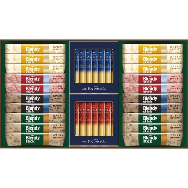 商品内容:●ブレンディスティック(カフェオレ14g×6・ミルクたっぷり14g×6・甘さなし11.4g×4・ヘーゼルナッツオレ11g×4)、ちょっと贅沢な珈琲店スティックブラック(ブラジルブレンド・モカブレンド)各2g×7