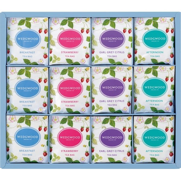ウェッジウッドの代表パターン「ワイルド ストロベリー」のパッケージに包まれた4種類のアソートティーバッグ。その日の気分に合わせて楽しめます。