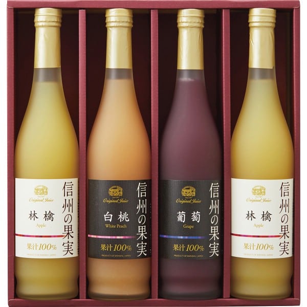 商品内容:●林檎ジュース500ml×2、葡萄ジュース500ml・白桃ジュース500ml×各1(※林檎・葡萄・白桃:信州産)