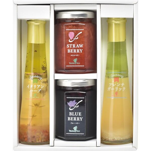 商品内容:●ジャム(ストロベリー・ブルーベリー)各145g×1、ドレッシング(イタリアンハーブ・フレンチガーリック)各122ml×1