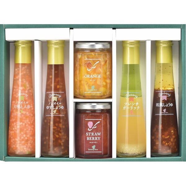 商品内容:●ジャム(オレンジマーマレード・ストロベリー)各145g×1、ドレッシング(ノンオイル大根と人参・ノンオイルゆずしょうゆ・フレンチガーリック・和風しょうゆ)各122ml×1