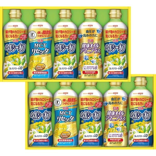 商品内容:●日清MCTリセッタ350g×2、日清健康オイルアマニプラス350g×2(機能性表示食品:届出番号A82、届出表示:本品は、α−リノレン酸を含んでおり、血圧が高めの方に適した機能を持つ食用油です。)、日清ヘルシーオフ350g×6