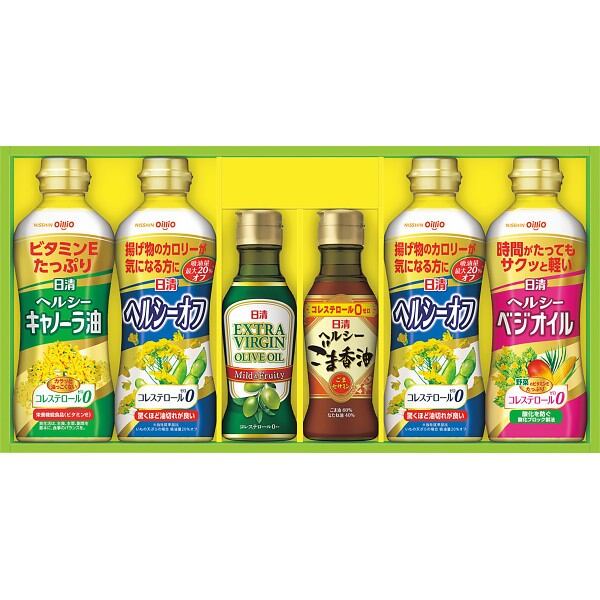 日清エキストラバージンオリーブオイルをはじめバラエティ豊かなヘルシーオイルを詰め合わせたギフトです。