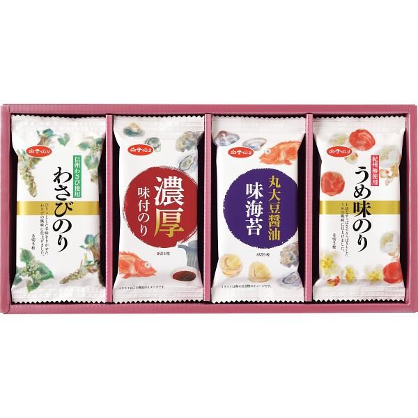 商品内容:●信州わさび使用わさびのり・濃厚味付のり・丸大豆醤油味のり・紀州梅使用うめ味のり各8切5枚×各2