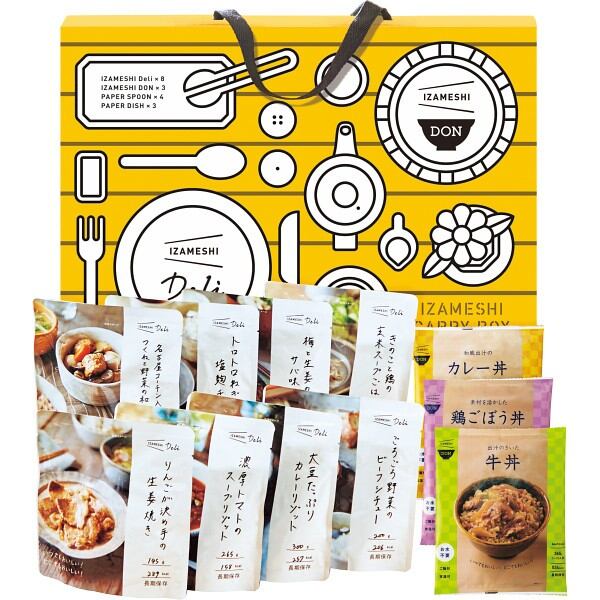 味にこだわった保存食・イザメシデリ8種と食べごたえのある丼シリーズ3種、紙皿、スプーンが同梱されたセットです。箱は簡易テーブルとしてご使用いただけます。自宅や会社での備蓄用としてはもちろん、お世話になっている方へのギフトとしてもオススメです。