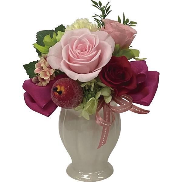 商品内容:●プリザーブドフラワー(バラ、アジサイ)フェイクフラワー(アジサイ、ヒバーナム、マム、リンゴ、リーフ)、リボン●花器(陶器)●お手入れのしおり付
