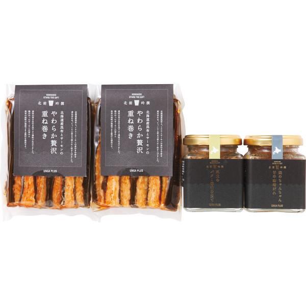 商品内容:●鮭のちゃんちゃん甘辛味噌だれ100g×1、帆立のバター醤油仕立て80g×1、北海道産昆布とサーモンのやわらか贅沢重ね巻き200g×2