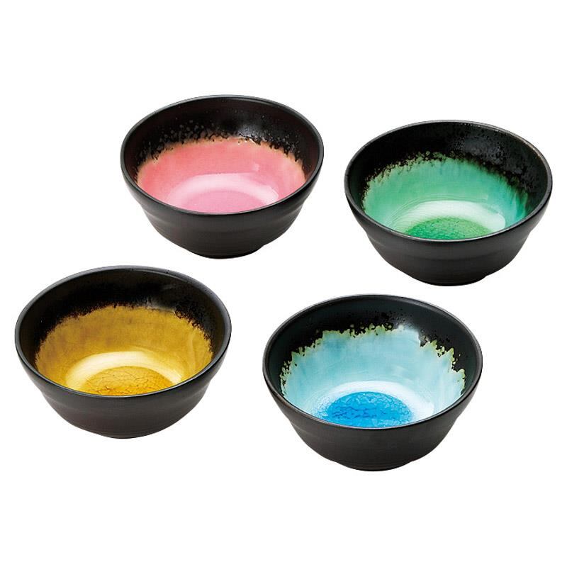 内側に鮮やかなガラス釉をあしらった4色の美濃焼の器は四季折々の趣を感じさせ料理を引き立てます。透かし彫りの木箱入り。