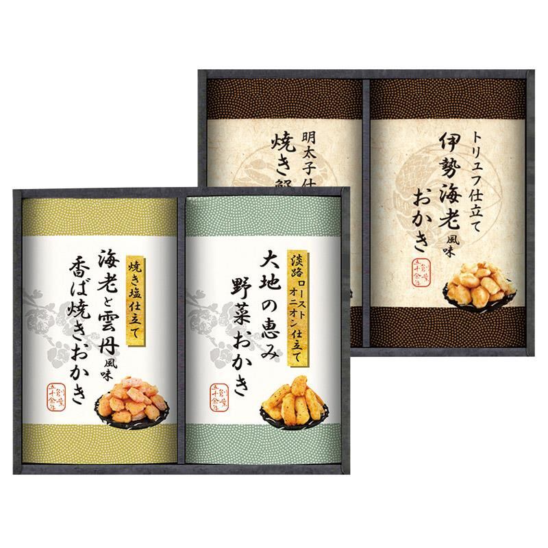 商品内容:トリュフ仕立て伊勢海老風味おかき(40g)・焼き塩仕立て海老と雲丹風味の香ば焼きおかき(40g)・淡路ローストオニオン仕立て大地の恵み野菜おかき(40g)・明太子仕立て焼き蟹おかき(40g)×各1