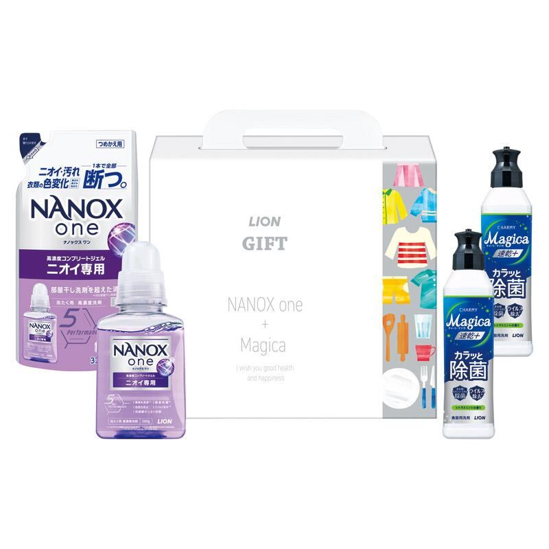 商品内容:NANOX oneニオイ専用(380g)・NANOX oneニオイ専用詰め替え(320g)×各1、チャーミーマジカ速乾+カラッと除菌シトラスミントの香り(220ml)×2