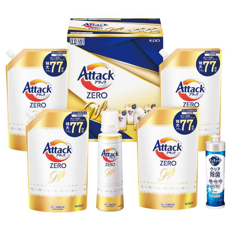 商品内容:アタックZERO(580g)・キュキュットクリア除菌(220ml)×各1、アタックZERO詰め替え(770g)×4