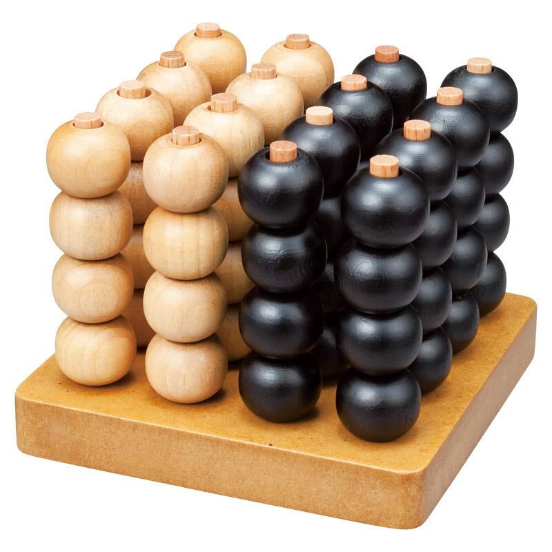 16本の棒に球を順番に差し置いていきます。縦・横・斜めと自分の球を4つ直線で並べて勝敗を決める。立体的に事を捉えて先を読む。簡単なルールながら奥深いゲームです。