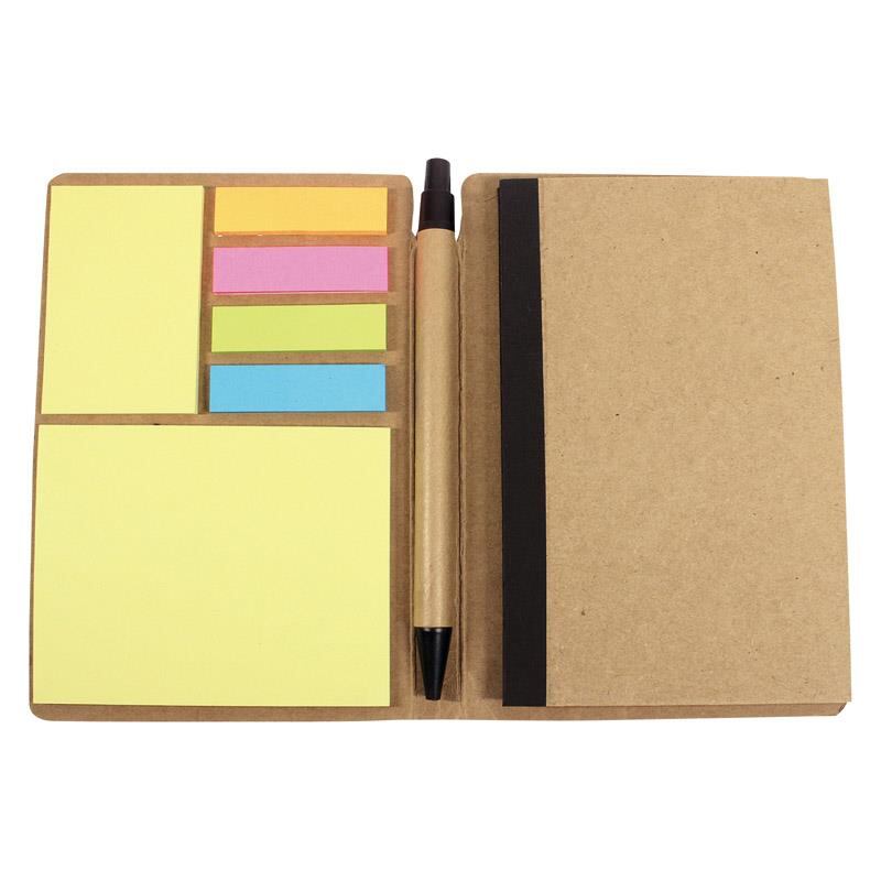 3種類の付箋、ノート、ボールペンがセットされた実用的なノートスタイルブック。手触り感が良いPVCの表紙と、開かないようしっかりとホールドするゴムバンドがポイントです。
