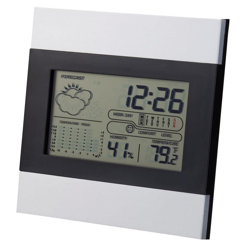 大きく見やすい液晶表示。高級感あふれるアルミフレームの多機能天気予報時計です。天気予報・カレンダー・時計・温度計・湿度計・アラーム。