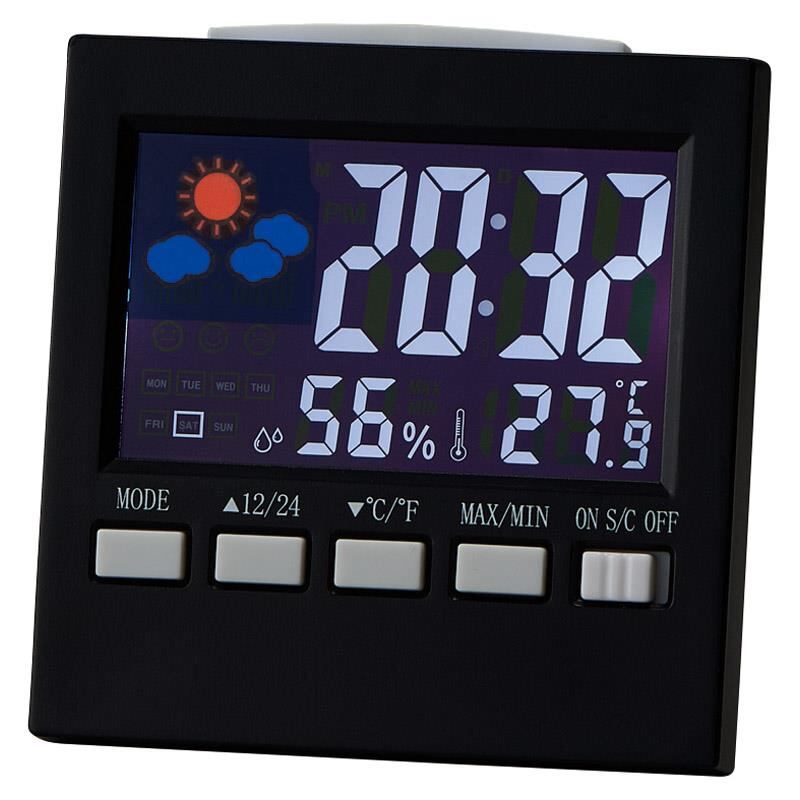 天気予報マークがカラーになっているので分かりやすくインテリアとしてもお洒落です。時計、アラーム、スヌーズ、カレンダー、温度計、湿度計、天気予報、バックライト、音振動センサー。
